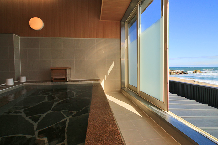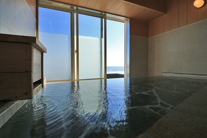 太田尻海岸で栄蔵と西行法師が詠った歌にちなんで、フロント棟二階にある水平線が遠くまでみえる眺めのよい男湯と女湯を「栄蔵の湯」、宿泊棟一階にある家族風呂を「西行の湯」と名付けさせていただきました。